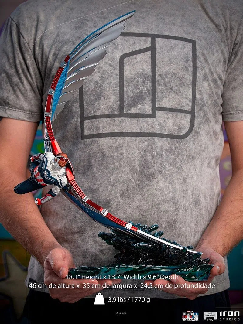 Auf einer Basis, die dem Hudson River ähnelt, durchschneidet der neue geflügelte Sentinel of Liberty mit einem seiner mächtigen mechanischen Flügel die Gewässer und nutzt dabei all seine verbesserte Manövrierfähigkeit und Agilität, wie ein echter Greifvogel, in seinem neuen Outfit mit Sternen und Streifen in den Farben der Flagge seines Landes, während er das legendäre Schild seines Vorgängers auf dem Rücken trägt. Er fliegt mit hoher Geschwindigkeit über New York City, um die Opfer der terroristischen und antinationalistischen Gruppe, bekannt als Flag Smashers, zu retten. Inspiriert von "One World, One People", der sechsten und letzten Episode der ersten Staffel der Miniserie "The Falcon and the Winter Soldier" auf dem Streaming-Kanal Disney+, präsentiert Iron Studios die Statue "Captain America Sam Wilson Deluxe - The Falcon and the Winter Soldier - BDS Art Scale 1/10", mit dem Helden, der früher Falcon genannt wurde, und nun den Namen und das Erbe des ersten Avengers annimmt.