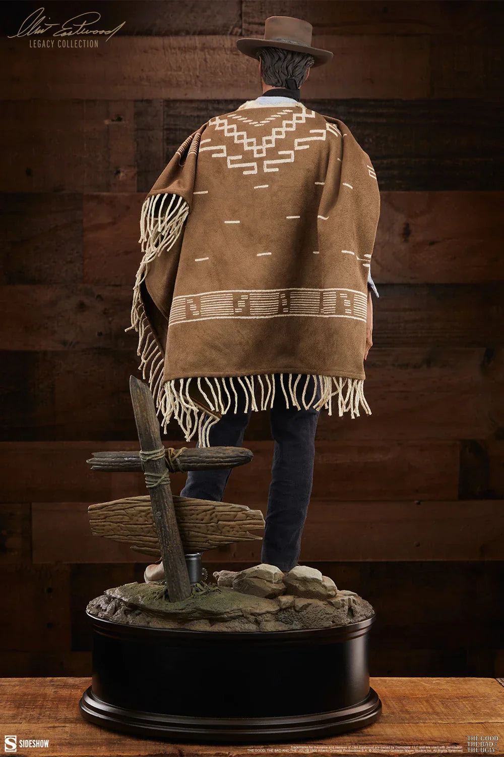 Die Mann ohne Namen Premium Format Figur trägt eine maßgeschneiderte Nachbildung des Kostüms des Charakters aus dem Film, bestehend aus einer Hose, Kunstledergürteln mit einem Holster, einem blauen Hemd, einer Kunstschafwollweste, einem Halstuch und seinem charakteristischen gemusterten Serape. Jede Naht, jeder Stich und jede hängende Fransen wurden sorgfältig gefertigt und umfangreich referenziert, um ein hochwertiges Kleidungsstück zu schaffen, das die detaillierte Skulptur darunter kleidet. Subtile Verwitterungen entlang des Hosenbunds und der skulptierten Stiefel vertiefen das Eintauchen der Statue in die trockene, felsige Umgebung. Komplett mit einem skulptierten Hut auf seinem Porträt, fängt der Mann ohne Namen Clint Eastwoods ikonische Bildschirmpräsenz ein und macht dies zu einem unverzichtbaren Mittelpunkt für Filmfans.