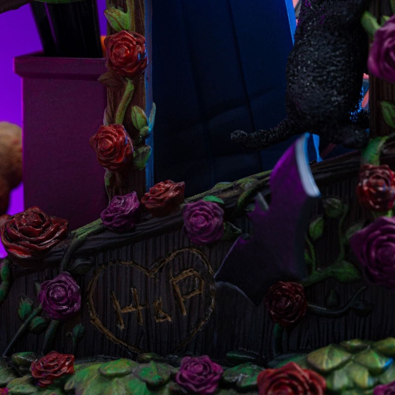 In dieser Deluxe-Version sehen wir Harley, die auf ihrem linken Bein balanciert und sich mit ihrer rechten Hand auf einen Baseballschläger stützt. Die Basis bildet ein Diorama, in dem Harleen die Brust eines Joker-Plüschtiers mit ihrem Schläger zerdrückt, während sie sich gegen ein hölzernes Geländer lehnt, das mit grünen Ranken und roten Blumen bedeckt ist, mit einem Batarang, der darin steckt. Ein kleines High Striker-Spielzeug mit einem gebrochenen oberen Teil, das Punchline darstellt, die neue Anhängerin des finsteren Clowns, dient als Stütze für ihren riesigen Hammer. Vor ihr befindet sich eine Kiste mit Waffen und Gadgets, die charakteristisch für andere ikonische lokale Verbrecher sind, einschließlich des Utility Belts ihres Rivalen, Souvenirs vergangener Zusammenstöße, die den Raum mit einem weiteren Plüschtier ihres Haustierhyänen namens Bruce teilen. In dieser chaotischen Umgebung spielen zwei Kätzchen zwischen Doubloons und Goldbarren, während die Bodenvegetation und Blumen auf ihre Verbündeten verweisen.