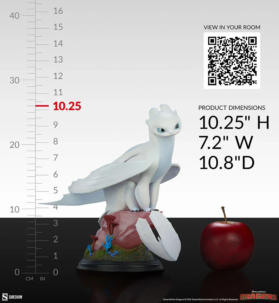 Die polystone Light Fury Statue ist vollständig skulpturiert und bemalt, um die eleganten Details des animierten Erscheinungsbildes des Drachen in einem Sammlerstück-Format einzufangen. Die Light Fury hat Schuppen auf ihrem Kopf und Krallen an ihren Füßen, und die abgerundeten Flossen ihres Schwanzes und ihrer Flügel fangen die Weichheit dieser geheimnisvollen Drachenart ein. Fertig mit einem perlmuttartigen weißen Glanz und blauen Akzenten, ist die Light Fury ein atemberaubendes Spektakel aus den Tiefen der Verborgenen Welt, das aus ihrem Versteck kommt, um deiner Sammlung beizutreten.