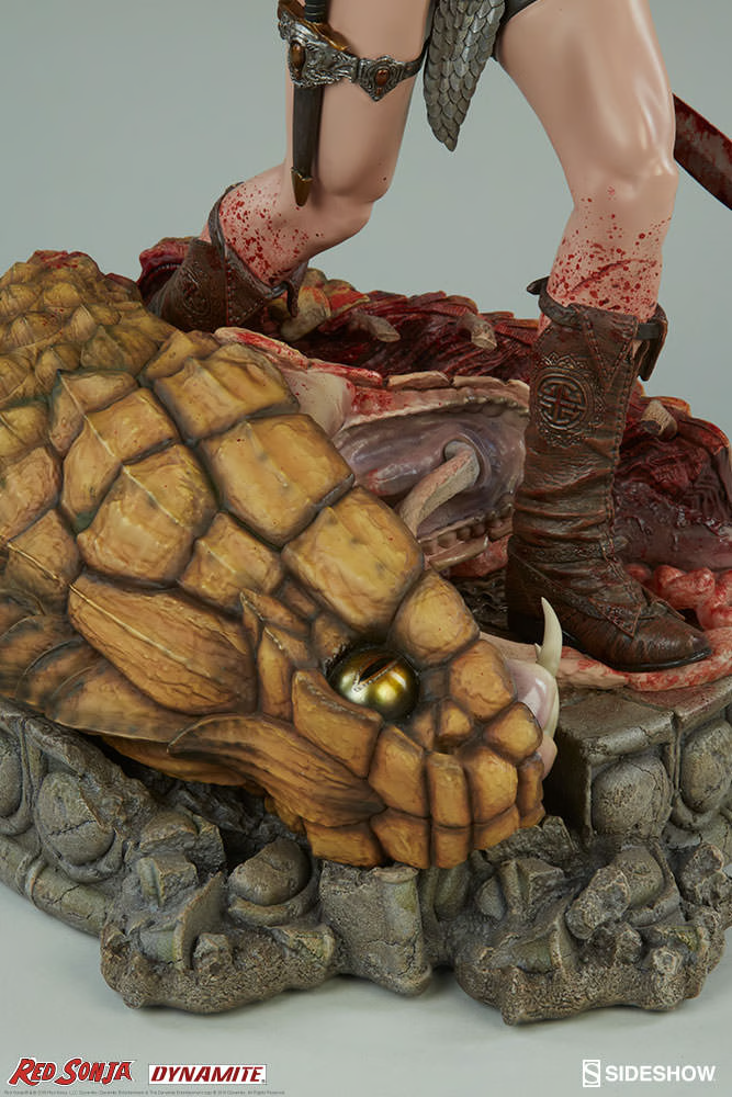 Seit ihrem furchtlosen Debüt im Jahr 1973 hat Rote Sonja das Fantasy-Genre mit ihrem feurigen Temperament und ihrer wilden Fähigkeit, jeden Mann oder jedes Tier im Kampf zu besiegen, neu definiert. Die selbstbewusste heldenhafte Frau mit roten Haaren benötigt auf ihren Reisen wenig Schutz, ihr schlanker, muskulöser Körper ist in spärlicher Schuppenrüstung, kunstvollen Manschetten und Schulterstücken sowie dicken Lederstiefeln und -handschuhen gekleidet. Ihr Gesicht ist eine Maske aus entschlossener Entschlossenheit und glühendem Stolz, während Rote Sonja sich ihren Weg durch den frischen, glänzenden Leichnam einer monströsen Schlange hackt, ihre beiden Klingen in dem Blut getränkt, das nur Augenblicke zuvor vergossen wurde. Mit einer Höhe von 20 Zoll in einer majestätischen dynamischen Komposition fängt Sideshows Rote Sonja, die Teufelin mit dem Schwert, Premium Format™ Figur die legendäre Kriegerin in ihrem besten Moment ein – ihren eigenen Weg bahnend und nur Tod und Zerstörung in ihrem Gefolge hinterlassend.