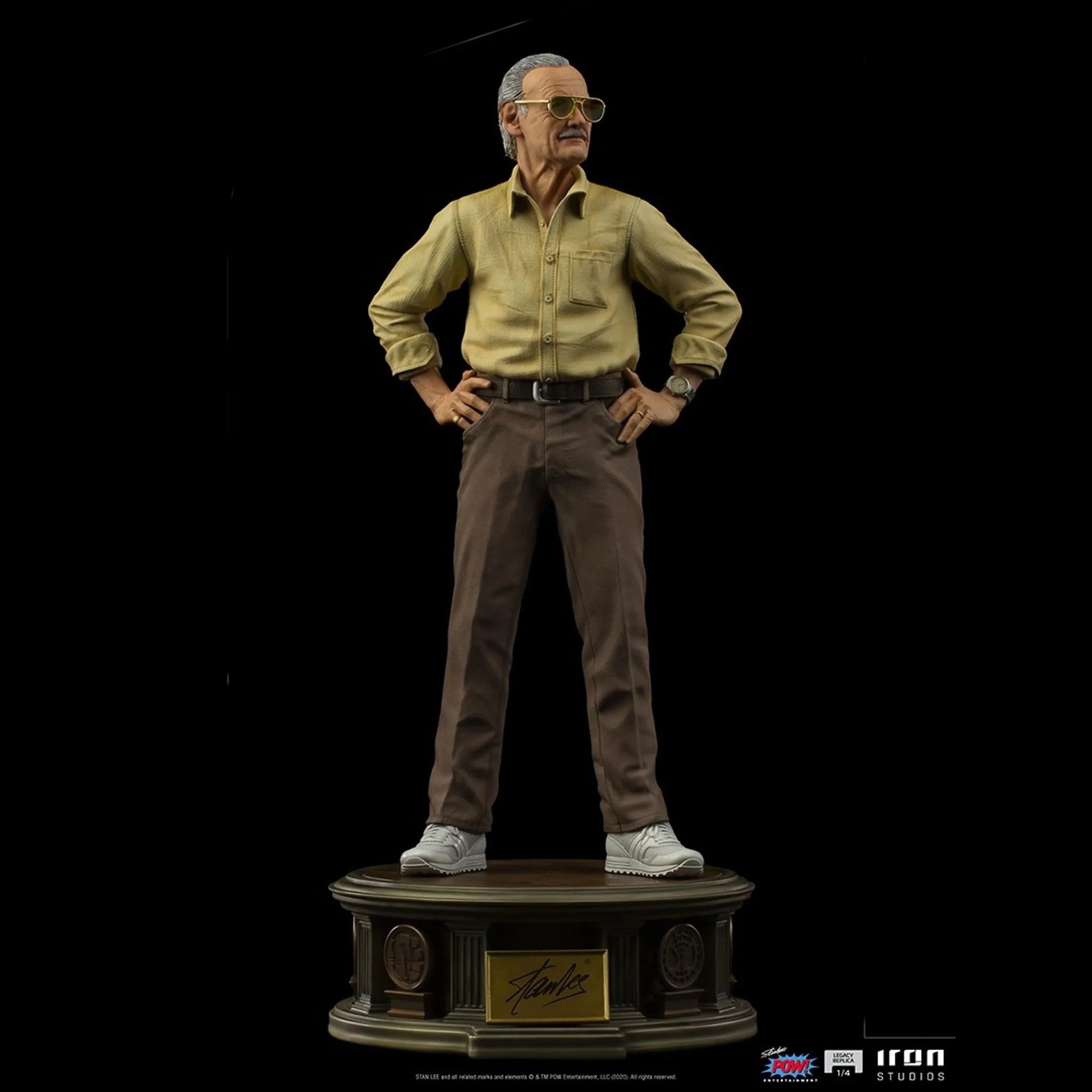 Eine Figur im beeindruckenden Maßstab 1/4, auf einer luxuriösen Basis mit Verzierungen darum herum, die an mehrere seiner berühmtesten Kreationen erinnern, und einer Frontplatte mit seiner unverwechselbaren Unterschrift, die uns in den Comics begleitet hat. Die Statue hat außerdem zwei Paar Arme und zwei austauschbare Köpfe für verschiedene Präsentationsposen, mit der Option, seine Arme ausgestreckt oder um seine Taille gelegt zu haben, wie er sagen würde, „Stan Lee präsentiert:”!