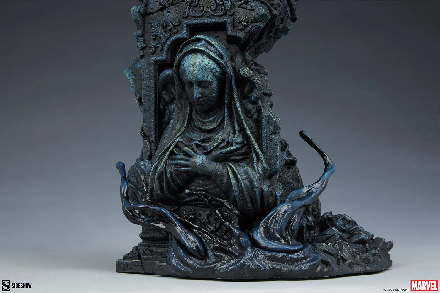 Die Symbiote Spider-Man Premium Format™ Figur ist 24 Zoll groß, während unser Lieblingswandkrabbler auf einem bröckelnden Kirchturm kauert. Tentakel der Klyntar-Symbioten-Substanz winden sich um die detaillierte Turmbasis, begierig darauf, sich mit ihrem Wirt zu vereinen. Der Turm unter ihm weist realistische steinartige Texturen sowie bröckelnde Reliefs auf, die eine weinende Frau und eine skelettartige Figur darstellen.