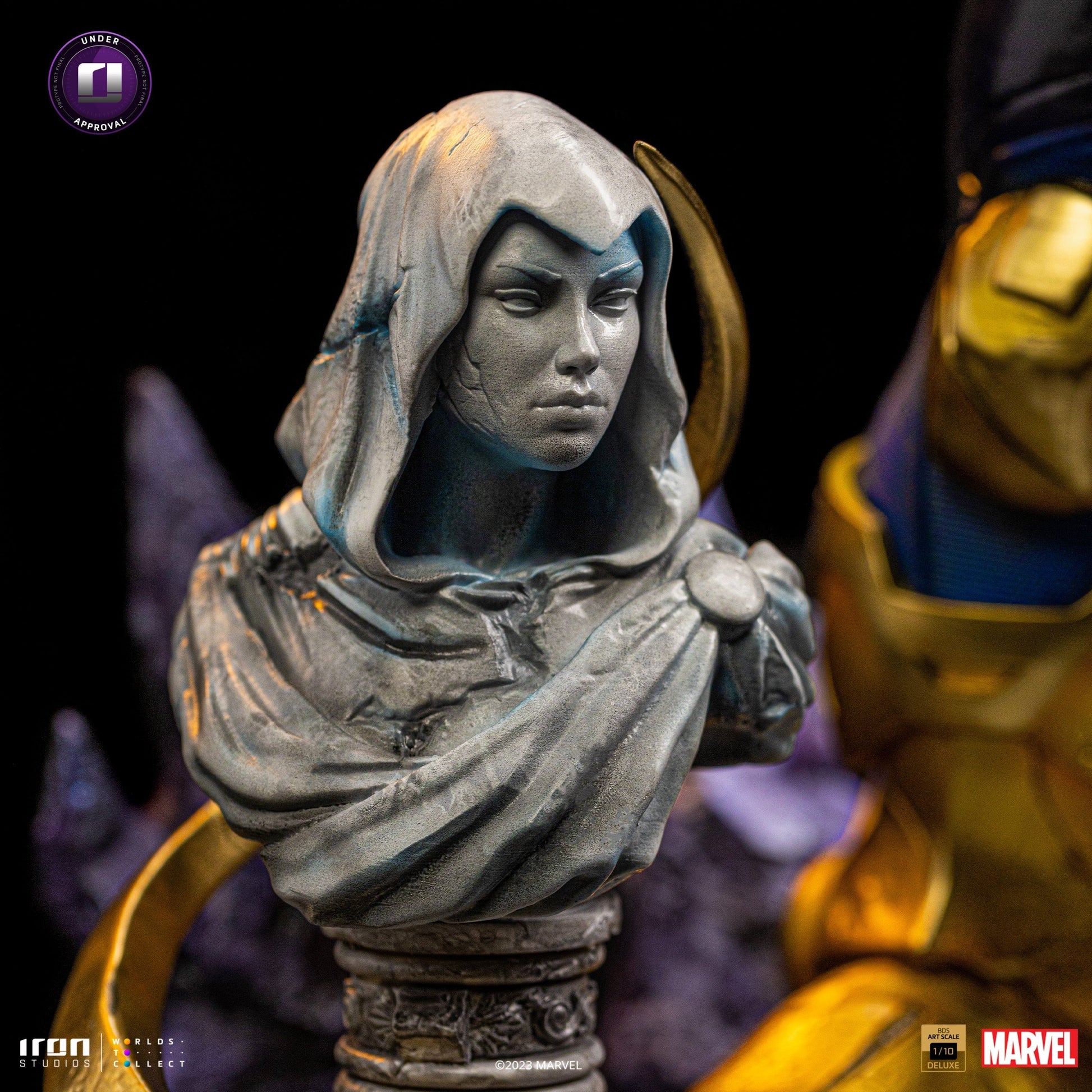 Auf der Basis eines Tempels, der Lady Death selbst gewidmet ist, hebt der Titan seine behandschuhte linke Hand mit seinem Infinity Gauntlet und demonstriert die Macht eines Halbgottes mit diesem Artefakt, das dazu gemacht ist, sechs kosmische Singularitäten in Steine zu verwandeln, von denen jeder einen Aspekt des Universums repräsentiert: den Raum, die Zeit, den Verstand, die Macht, die Seele und die Realität, was seinen Nutzer nahezu allmächtig macht. Verliebt in die Personifikation des Todes in Form einer schönen Frau, beinhalten seine Pläne normalerweise universellen Völkermord, um seine Geliebte zu umwerben, die in der Statue neben ihm in Form eines Büsten auf einem Sockel dargestellt ist. Verrückt, ewig und unvermeidlich, ist er all das und noch viel mehr, und als Antwort auf die Bitte von Fans und Sammlern präsentiert Iron Studios stolz die Statue "Thanos Deluxe - Infinity Gauntlet Diorama - BDS Art Scale 1/10", die erste einer neuen Serie, die aus den mächtigsten Helden der Erde aus dem Marvel-Universum besteht, in einer Sammlung, die ein weiteres unglaubliches Schlacht-Diorama-Set bilden wird.