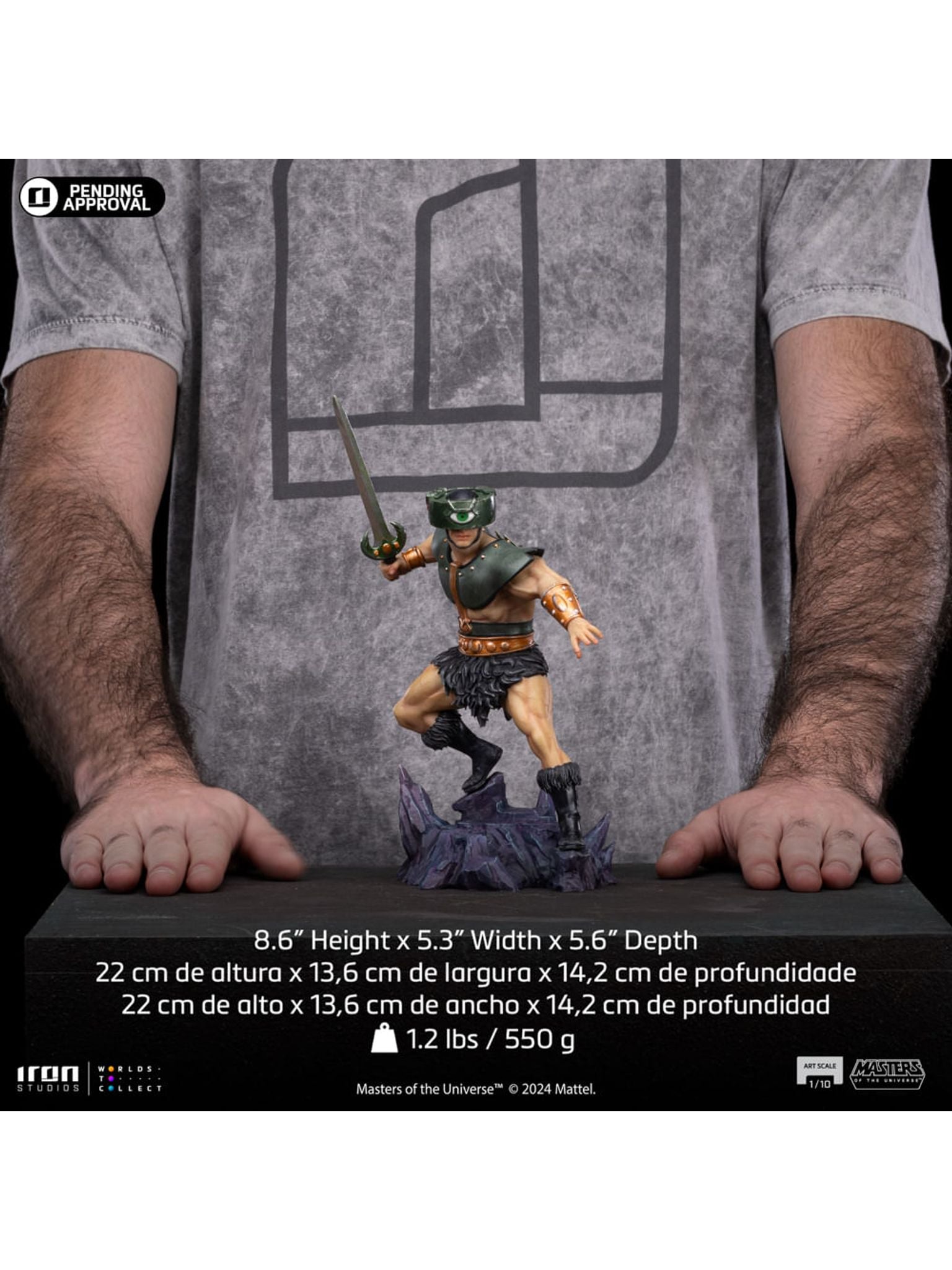 In seiner charakteristischen grünen Rüstung mit Fell, bereit zum Kampf gegen He-Man und seine Verbündeten, steht er auf einer zerklüfteten Felsbasis und zeigt Tri-Klops' Meisterschaft im Kampf. Mit einem Schwert in seiner rechten Hand und Dolchen auf seinem Rücken ist seine größte Waffe das prägende Merkmal seines Charakters, sein rotierender Helm mit drei verschiedenen Augen, der es ihm ermöglicht, aus großer Entfernung, in völliger Dunkelheit und sogar durch feste Objekte zu sehen. Dies ist die "Tri-Klops – Masters of the Universe – Art Scale 1/10" Statue von Iron Studios, die einen weiteren Bösewicht aus Eternia zeigt.