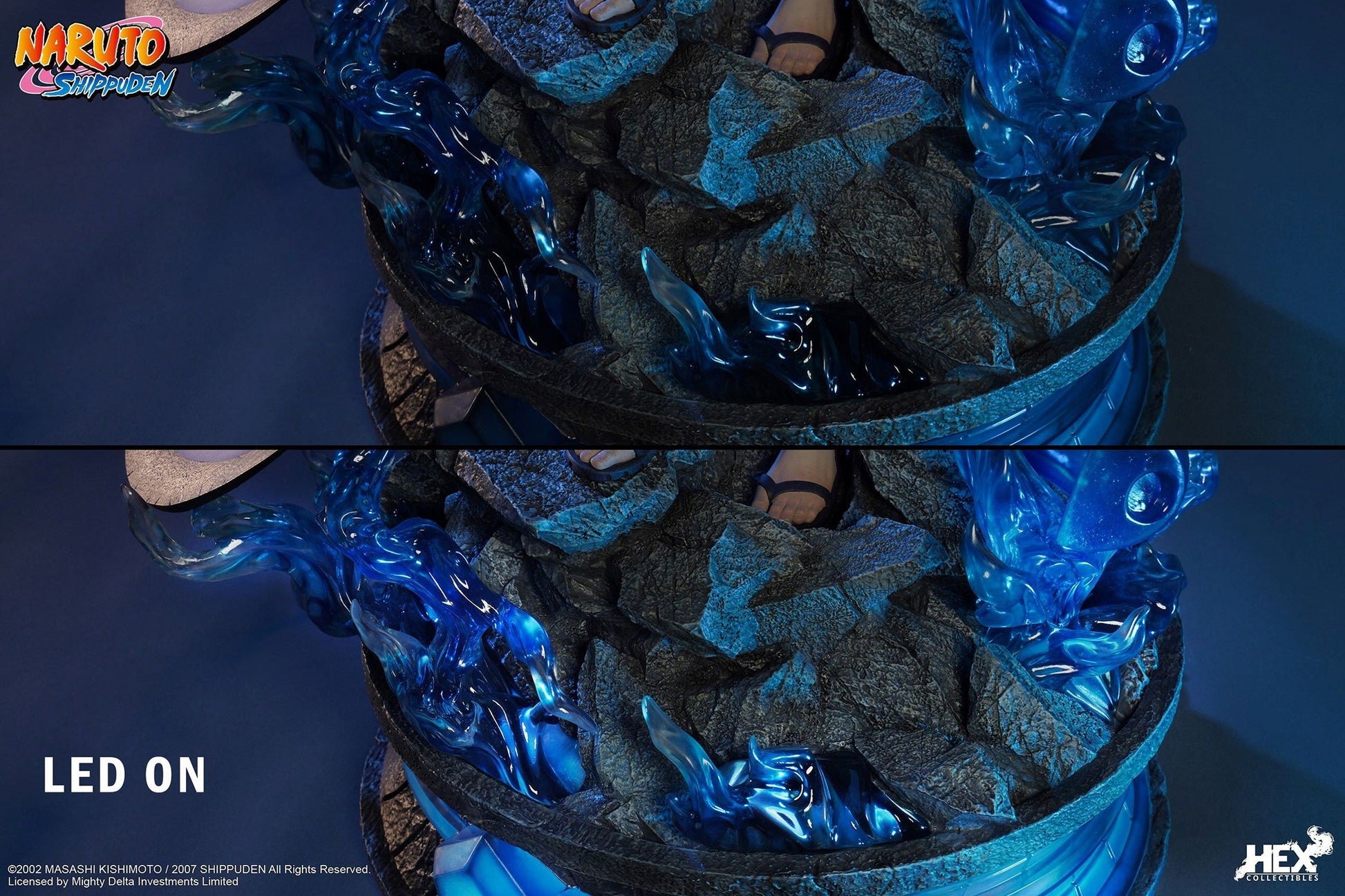 Der runde Sockel, der felsartige Texturen aufweist, ist mit einem sternförmigen Stirn- und Taillenschutz von Susano’o dekoriert. Transparente Rippen, die von Susano’o gebildet werden, bedecken Madaras Körper, und Chakra-Flammen brechen aus der felsigen Basis aus, was der Statue ein dynamisches Gefühl verleiht.